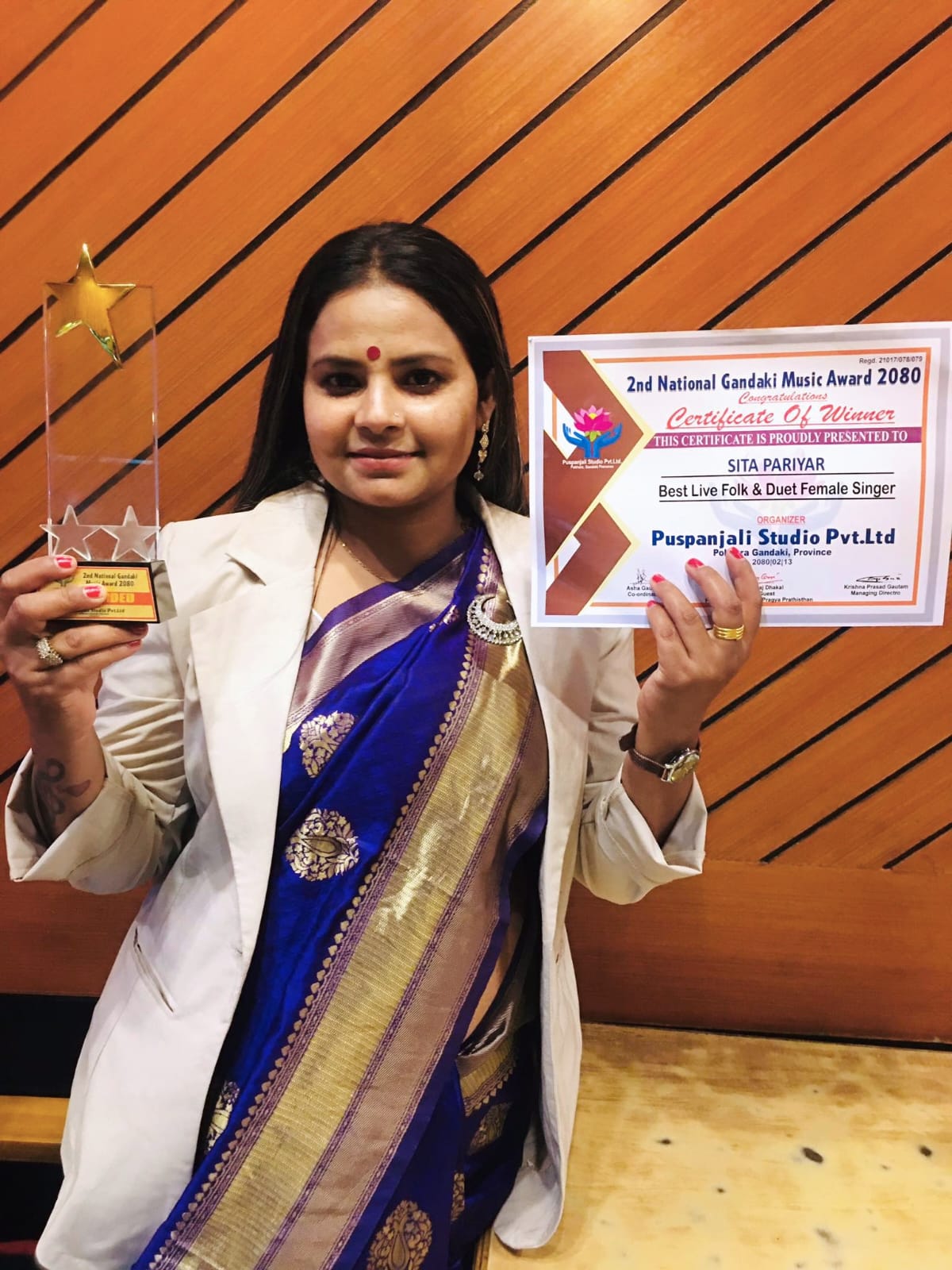 चर्चित लोक तथा दोहोरी गायिका सीता परियारले दोस्रो राष्ट्रिय गण्डकी म्युजिक अवार्ड २०८० मा सर्वोत्कृष्ट प्रत्यक्ष दोहोरी गायिकाको अवार्ड प्राप्त गर्नुभएको छ । पुष्पान्जली स्टुडियो पोखराको आयोजनामा जेठ १३ गते सम्पन्न कार्यक्रमको एक समारोहकाबीच उक्त अवार्ड प्राप्त गर्नुभएको हो । ग्रहण गर्नुभएको हो । कार्यक्रममा पोखरा प्रज्ञा प्रतिष्ठानका कुलपति पदमराज ढकालले उक्त अवार्ड गायिका सीताका श्रीमान् पूर्ण परियारलाई प्रदान गर्नुभएको हो । ४० भन्दा बढी विधामा अवार्ड वितरण गरिएको सो कार्यक्रममा परियारसँंगै नेपालका चर्चित कलाकारहरुले फरक फरक विधामा अवार्ड प्राप्त गरेका हुन् ।
