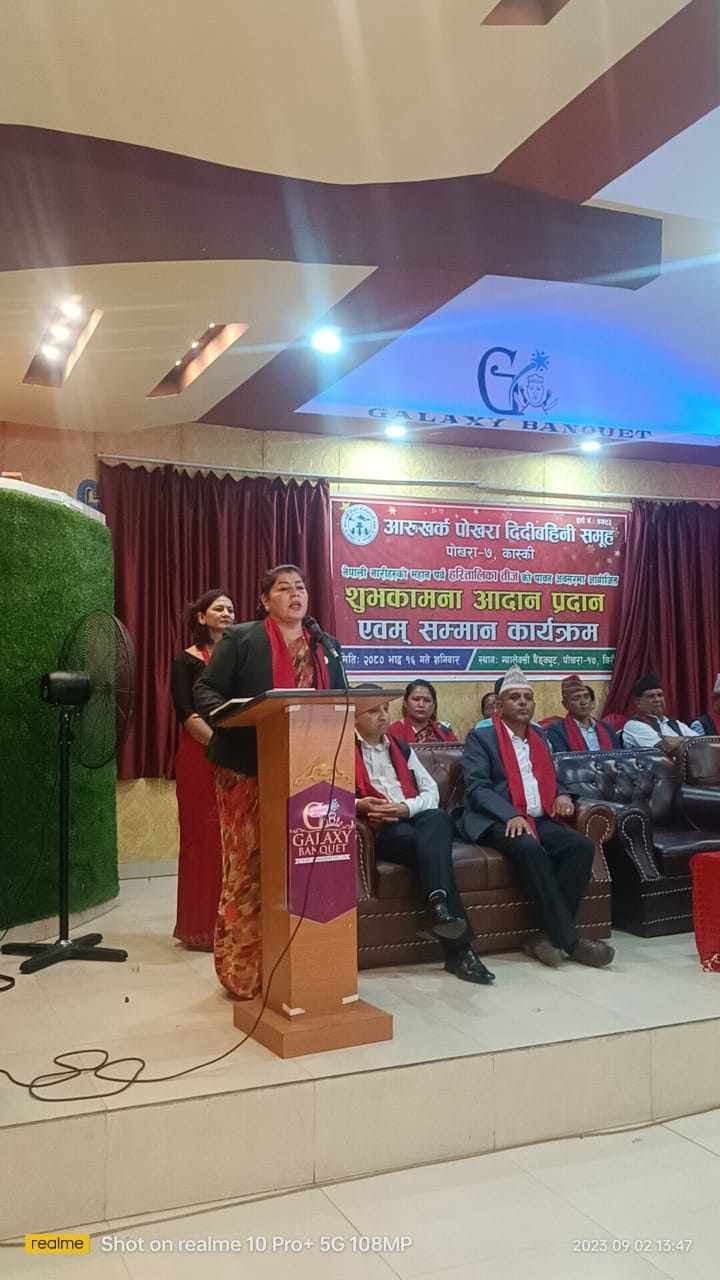 आरुखर्क–पोखरा दिदीबहिनी समूह पोखराले हरितालिका (तीज) को अवसरमा शुभकामना आदान प्रदान एवं सम्मान कार्यक्रम गरेको छ । कार्यक्रमको उद्घाटन गर्नुहुँदै प्रमुख अतिथि गण्डकी प्रदेशका उर्जा, जलश्रोत तथा खानेपानी मन्त्री सरस्वती अर्याल तिवारीले तीज पर्वले विशेष गरी नेपाली जनजीवनको सामाजिक, धार्मिक, सांस्कृतिक पहिचान ब्यक्त गर्ने पर्व भएको बताउनुभयो । उहाँले तीज पर्व नेपाली महिलाहरुको ईतिहाससँग जोडिएकाले पनि ब्रत, उपवास, उपासना, आरधनाको माध्यमबाट धार्मिक तथा सांस्कृतिक पक्षको पोषण गर्दै नारी जातिको अस्तित्वलाई शिखरमा लैजाने प्रयास यस पर्वले गर्ने बताउनुभयो । तीज पर्व नेपाली महिलाहरुको मौलिकतासँग जोडिएकोले पनि यसको मौलिकतालाई बचाईराख्नुपर्नेमा जोड दिनुभयो ।
