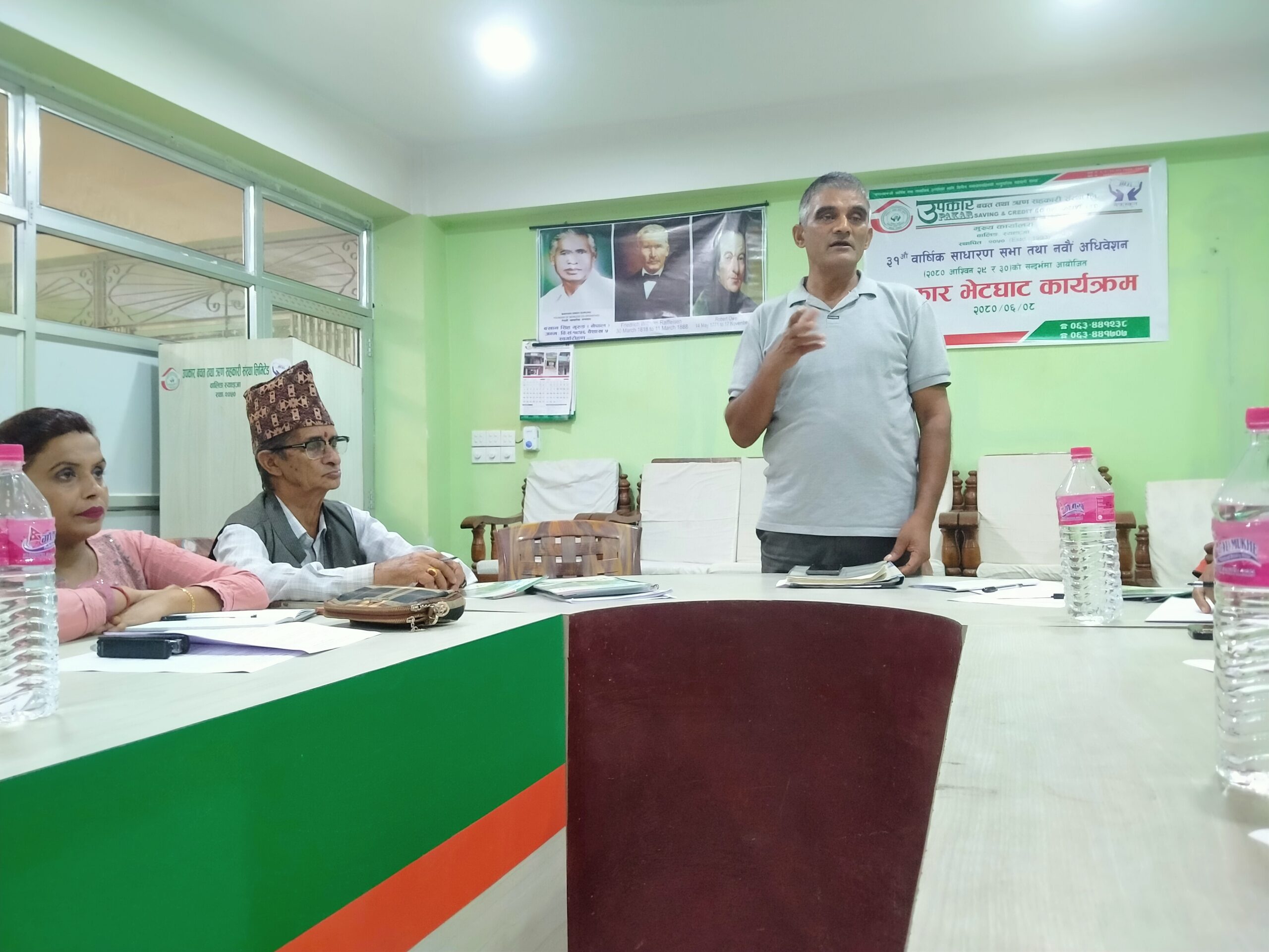 मंसिर ७ गतेसम्म वर्तमान कार्यसमितिको कार्यकाल रहेकाले पनि कार्यकाल सकिन २ महिना अगावै अधिवेशनमार्फत नयाँ नेतृत्व निर्वाचित गर्ने तयारीमा सहकारी रहेको हो । आश्विन २९ गते सबै सेवाकेन्द्रमा साधारणसभा गरिने छ । सबै सेवाकेन्द्रको प्रतिनिधिमूलक उपस्थितिमा संस्थाको मुख्य कार्यालय वालिङमा ३० गते साधारणसभा सम्पन्न गर्ने कार्यक्रम रहेको छ । सोमबार संस्थाको सभाहलमा आयोजित पत्रकार भेटघाट कार्यक्रममा संस्थाका कार्यबहाक अध्यक्ष लक्ष्मीपति पौडेलले संस्थाको पारदर्शिताकालागि र आफ्ना सदस्यहरुलाई संस्थाको विषयमा जानकारी दिने उद्देश्यले पत्रकार भेटघाटको आयोजना गरिएको बताउनुभयो । संस्थाले जनयुद्दको संक्रमणकालीन समय, कोभिड १९को महामारी, आर्थिक मन्दीका विभिन्न समस्याहरुसंँग जुध्दै यहाँसम्म आईपुग्दा पनि संस्थाले आफ्ना सदस्यहरुलाई भरोसा विश्वास कायम राख्न सफल भएको कार्यबहाक अध्यक्ष पौडेलले बताउनुभयो । संस्थाकाबारेमा सदस्यहरुलाई पारदर्शीरुपमा जानकारी गराउँदै आएको उहाँले बताउनुभयो । कार्यक्रममा संस्थाका निमित्त महाप्रबन्धक झलकनारायण पाण्डेले संस्थाको कारोबारका विषयमा जानकार गराउनुभएको थियो भने पत्रकार महासंघ स्याङ्जाका अध्यक्ष श्रीकृष्ण सिग्देलले संस्थाले उत्पादनमूलक कार्यमा लगानी गर्नुपर्नेमा जोड दिनुभएको थियो । कार्यक्रमको सञ्चालन सचिव यज्ञप्रसाद अधिकारीले गर्नुभएको थियो । संस्थाले राहत कोषमार्फत सदस्यहरुलाई मृत्यु संस्कार, असाध्य रोग उपचारमा सहयोग पुगोस् भन्ने हेतुले नगद सहयोग गर्दै आएको छ मातृ शिशु स्याहारकालागि पनि पोषणयुक्त आहारका लागि नगद प्रदान गर्दैै आएको छ ।