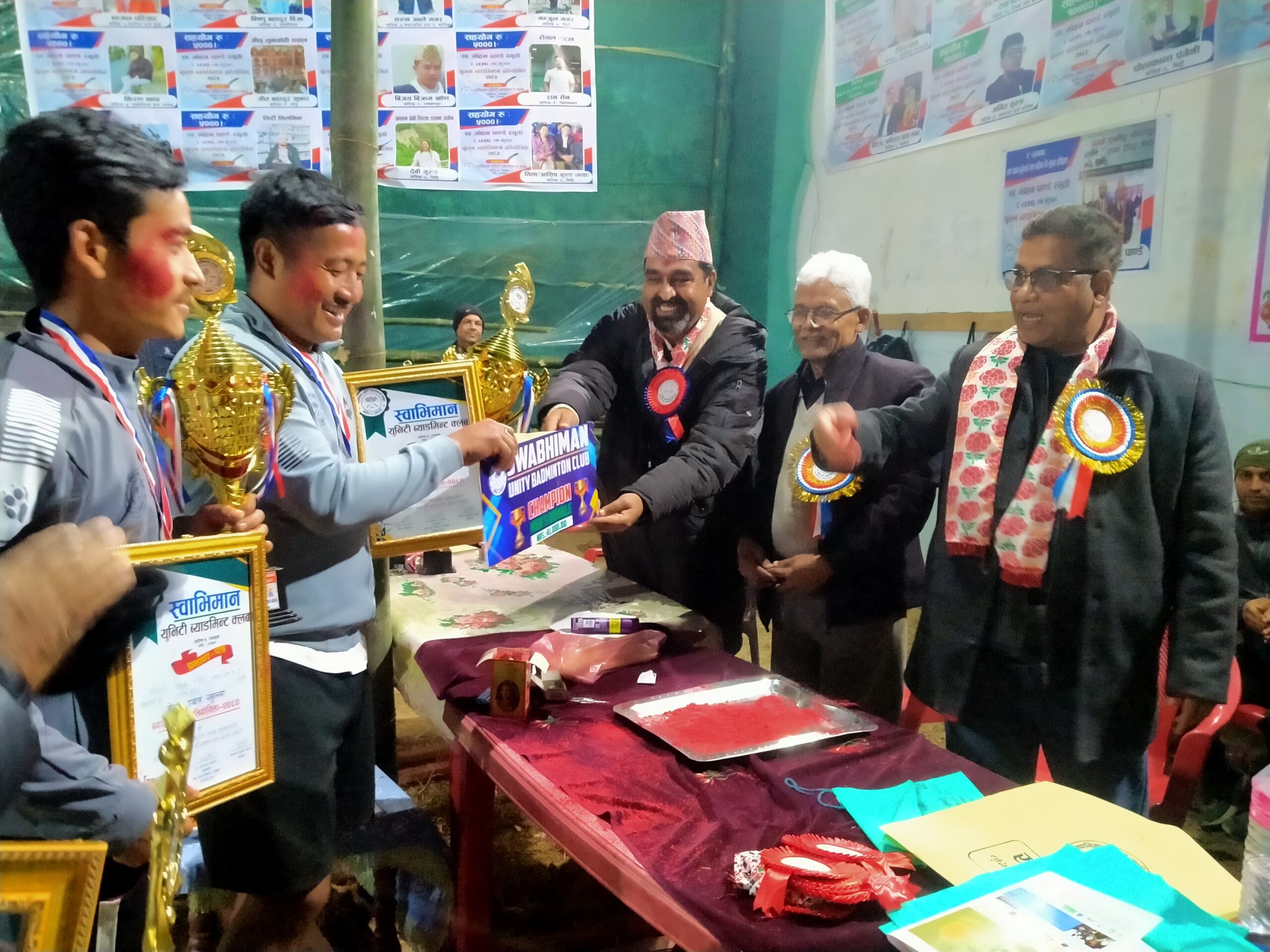 बिजयी समूहहरुलाई पुरस्कार वितरण गर्नुहुँदै गण्डकी प्रदेशका अर्थ तथा विकास समितिका सभापति भोजराज अर्यालले खेल क्षेत्रले फड्को मार्दै ब्यवसायिकतातर्फ उन्मुख भएको बताउनुभएको छ । उहाँले खेलेर नै जीविकोपार्जन गर्न सकिने वातावरण बन्दै गएको बताउनुहुँदै अझै यसलाई ब्यवस्थित र विस्तार गर्नुपर्नेमा जोड दिनुभयो । उहाँले आगामी दुई वर्षभित्रमा वालिङभित्रै ईन्डोर ब्याडमिण्टन कभर्डहल बनाउने योजनामा आँफू रहेको बताउनुभयो । उहाँले भन्नुभयो, “अबको दुई वर्षमा वालिङमा ईन्डोर ब्याडमिण्टन कोर्ट बनाएरै छाड्छु यो मेरो प्रतिवद्धता भयो ।”